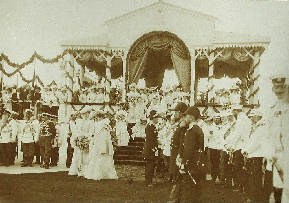 Императрица Александра Федоровна (в центре), придворные дамы, высшие офицерские чины и городские жители у царской палатки во время церемонии спуска на воду крейсера "Очаков".