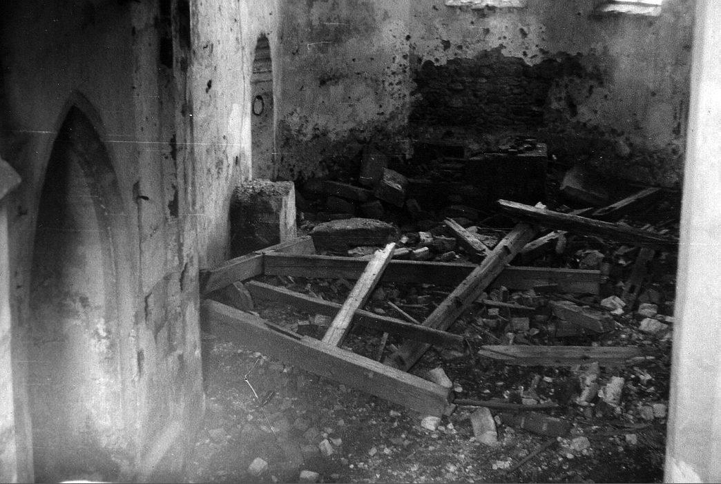Cetviny, kostel Narození Panny Marie, loď kostela směrem k oltáři s propadlou střechou
