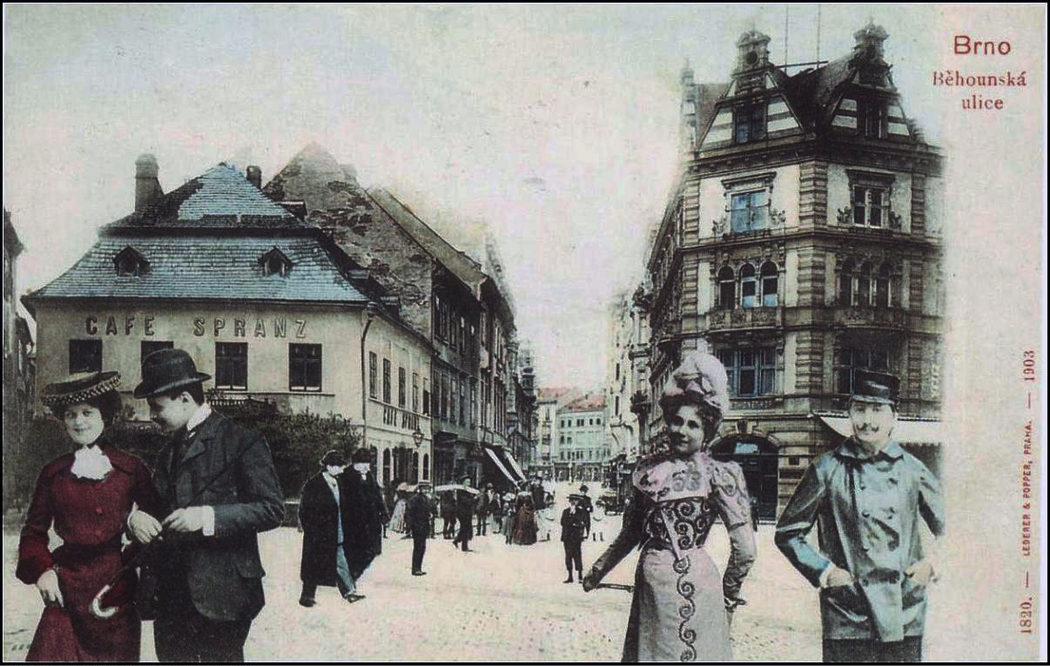 Běhounská, Průhled z Jakubského náměstí Běhounskou ulicí s Spranzovou kavárnou