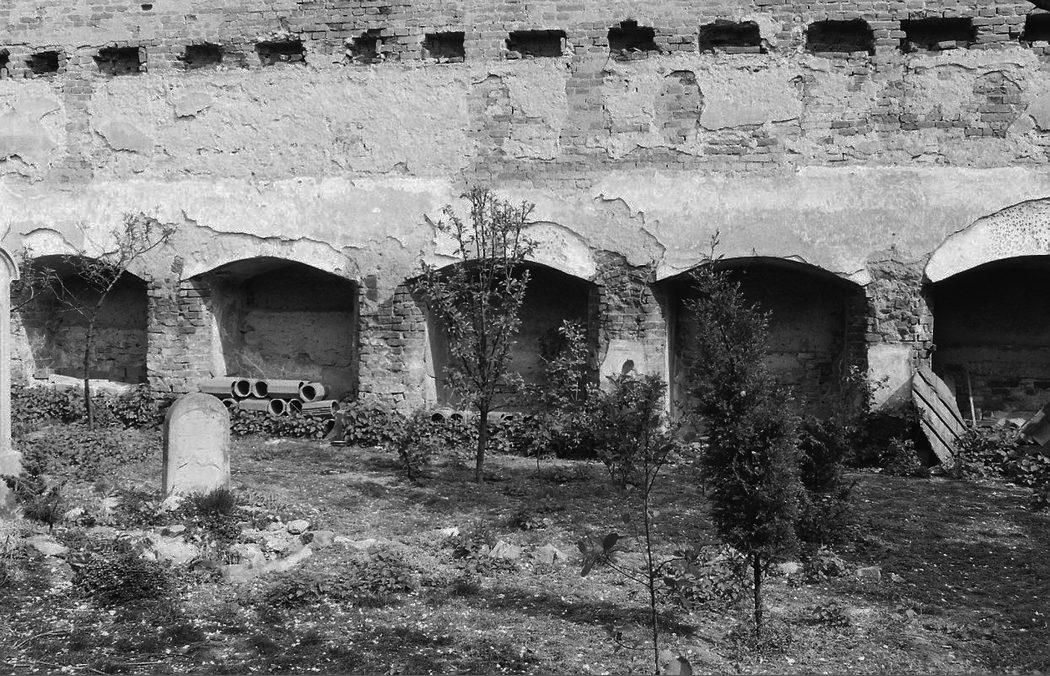 Strážnice, synagoga. Západní strana budovy se zazděnými arkádami (průhledy) odbourané ženské lodi