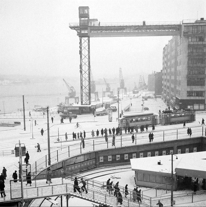 Tunnelbanestationen vid Slussen. Spårvagnar på Katarinavägen. Katarinahissen och kranar på Stadsgården