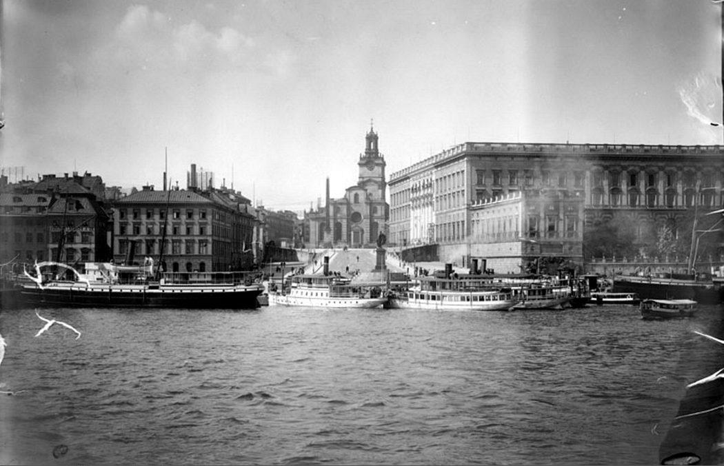 Skeppsbrokajen och Slottsbacken från Skeppsholmen. Storkyrkan i bakgrunden