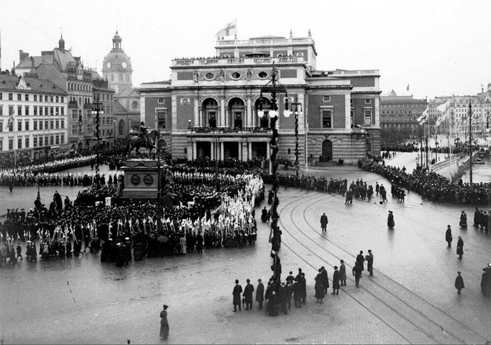 Gustav Adolfs Torg vid firandet av Gustav II Adolfs dödsdag. I fonden Operan