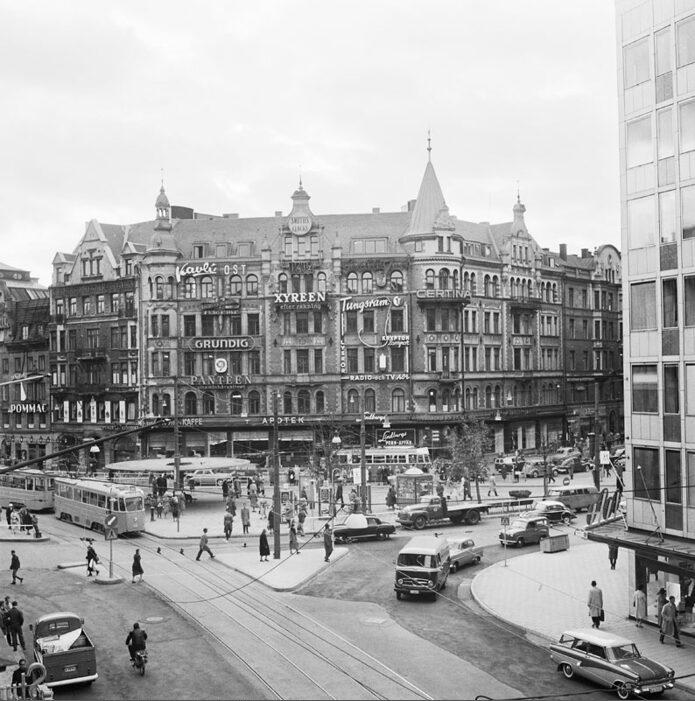 Stureplan. Vy sedd från Sturegatan mot kvarteret Sumpen. Kungsgatan och Biblioteksgatan