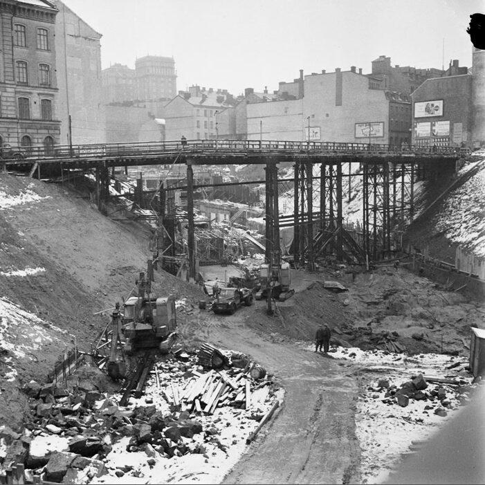 Rivning och tunnelbanebygge kring blivande Sergels Torg. Mäster Samuelsgatan går över tillfällig bro