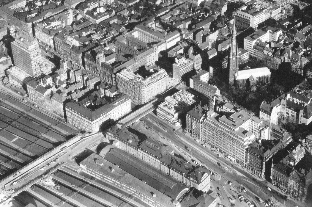 Västra Norrmalm med Klara kyrka, Stockholms central och Klarabergsviadukten. I bildmitt syns Hotell Continental under uppförande