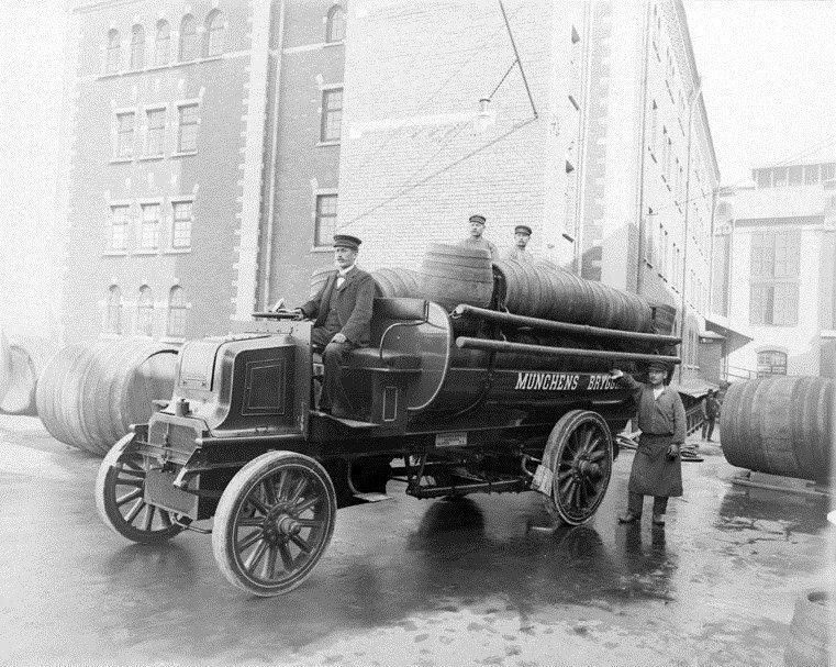 Münchenbryggeriets första bil, märke Daimler, utanför bryggeriet