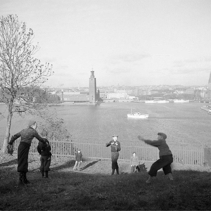 En grupp pojkar på Mariaberget. Utsikt mot Stadshuset från Bastugatan
