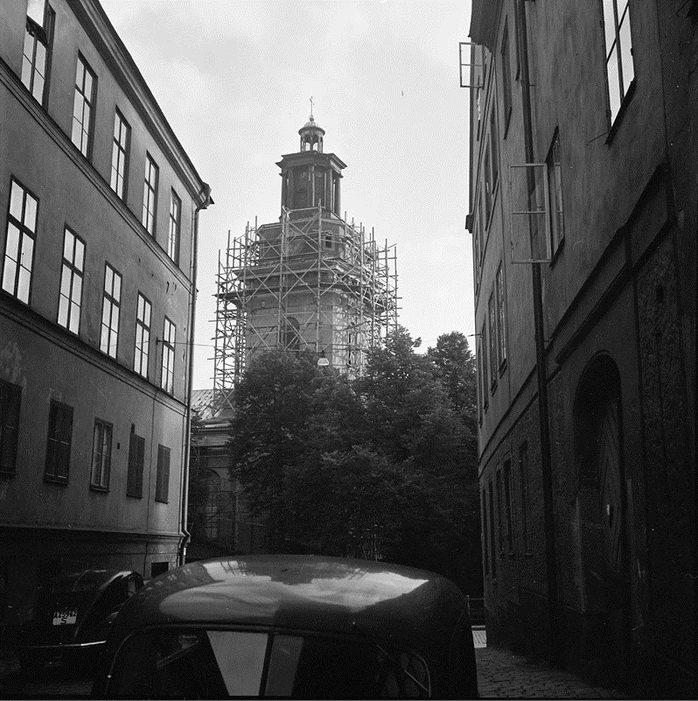 Maria Magdalena kyrka med byggnadsställningar, sedd från Maria Trappgränd