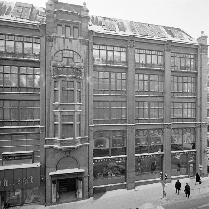 Exteriör av Hamngatspalatset med Sidenhusets och Apoteket Lejonets entréer