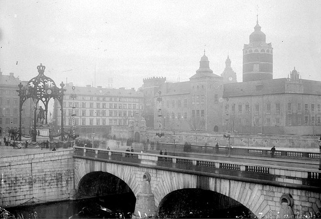 Norrbro med Gustav Adolfs Torg under Gustav II Adolfs jubileum, från Helgeandsholmen