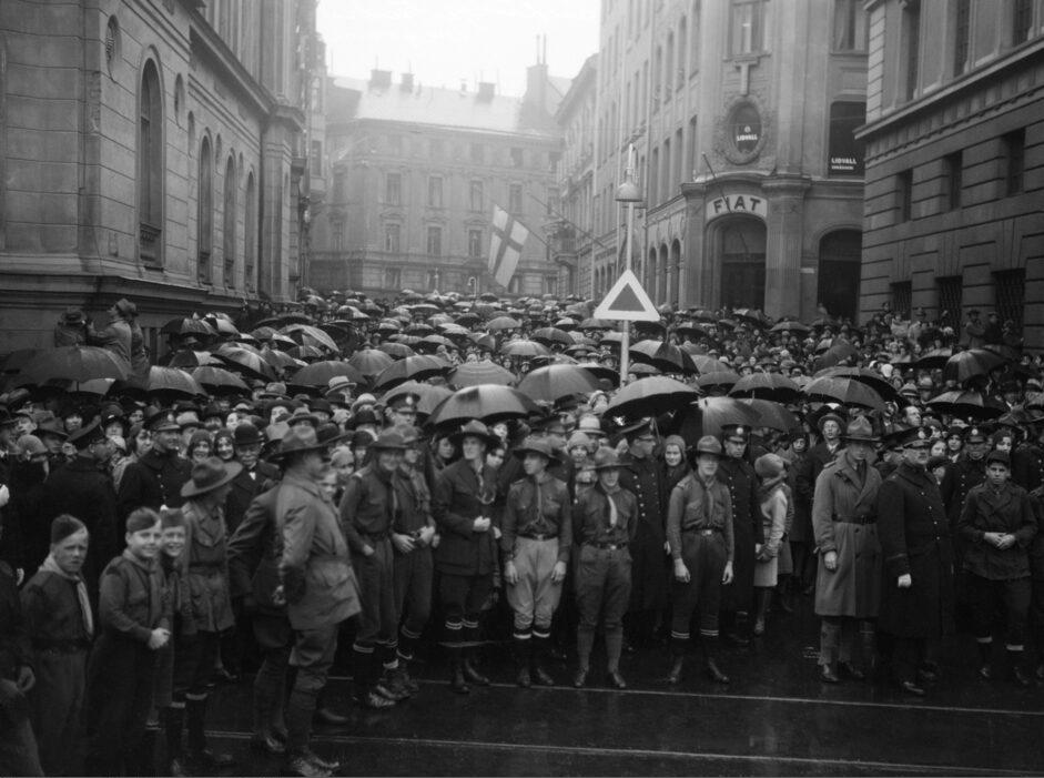 Folksamling på Arsenalsgatan österut från Kungsträdgårdsgatan i väntan på begravningståget med stoften efter de förolyckade från Andréexpeditionen
