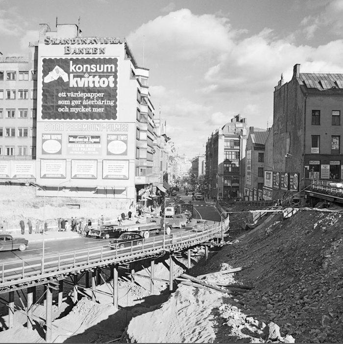 Hamngatan österut från Malmskillnadsgatans bro. Konsumreklamen sitter på gaveln till Hamngatan 22