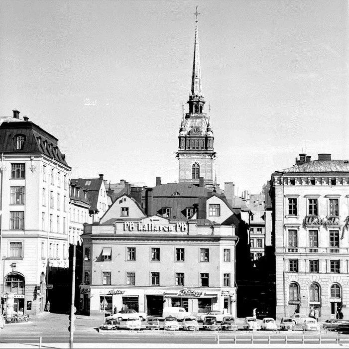 Mälartorget 17: "Källaren P.B.". Tyska kyrkans torn i fonden