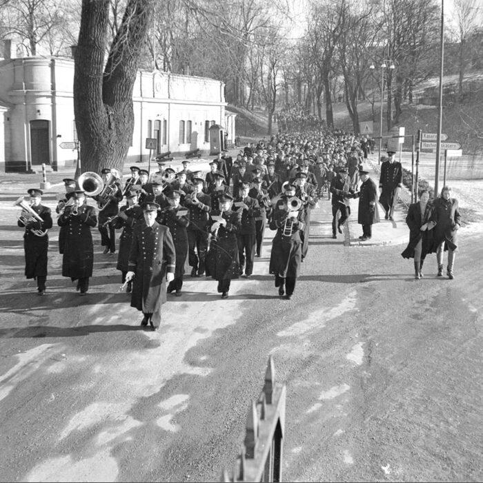Militär musikkår leder tåget av skolbarn som besöker Skeppsholmen