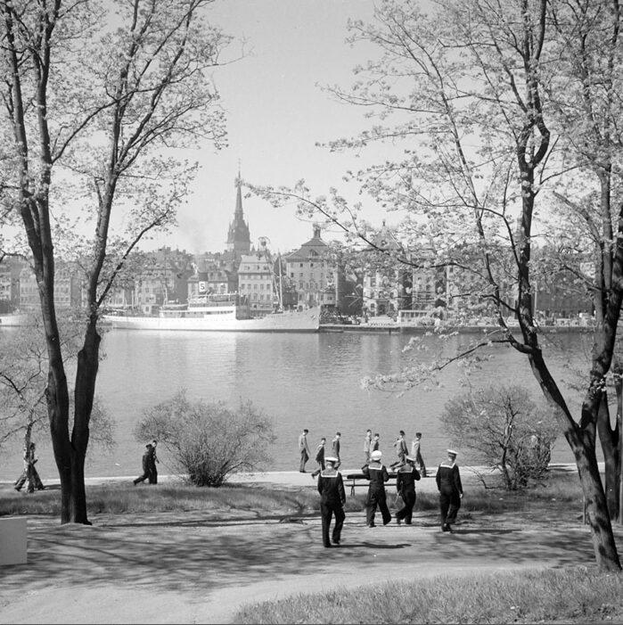 Matroser på Skeppsholmen med utsikt mot Strömmen och Gamla Stan