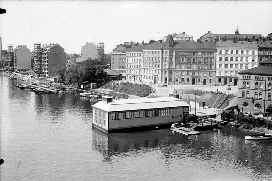 Liljeholmsbadet sett mot Hornsgatans mynning vid Hornstull. I bakgrunden kv. Sågen