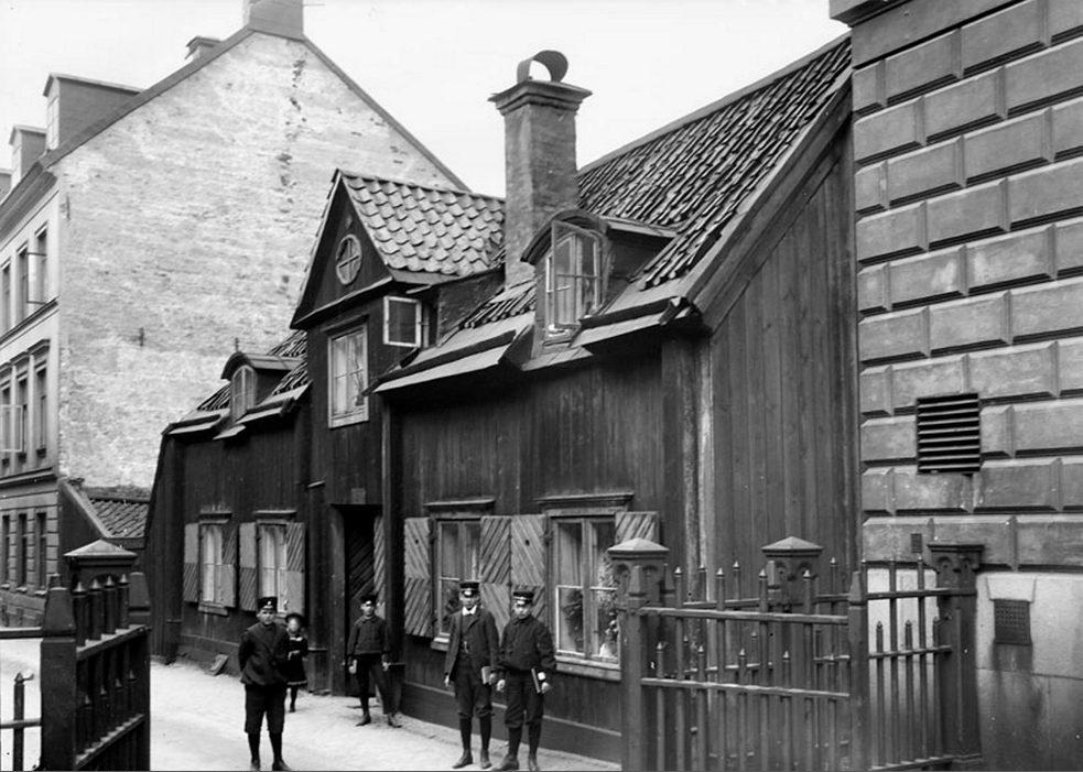 Ragvaldsgatan 21. Skolpojkar vid Södra Latins grindar