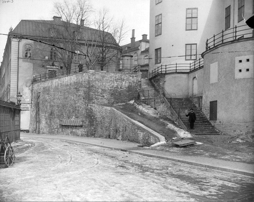Terrassen, Västermur vid Norra Riddarholmshamnen, mellan Auktionsverkets hus och Wrangelska palatset