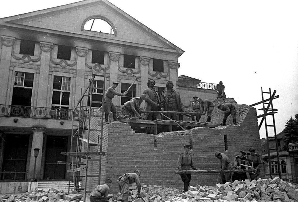Советские солдаты разбирают укрепление вокруг памятника Гете и Шиллеру