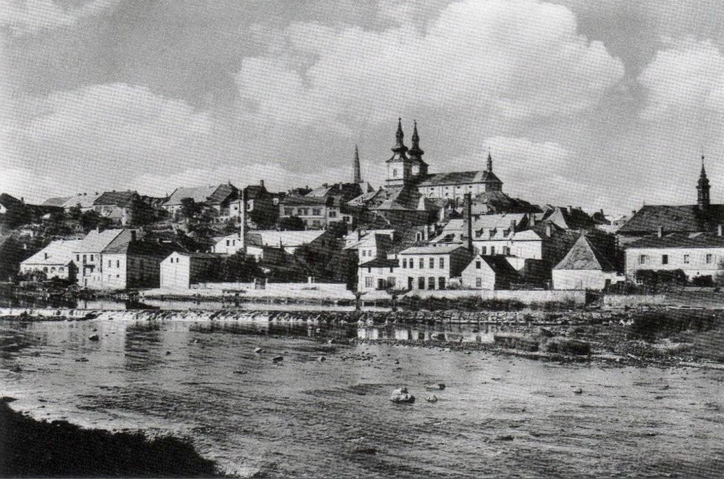 Kadaň, celkový pohled na kostel s márnicí (v popředí vpravo)