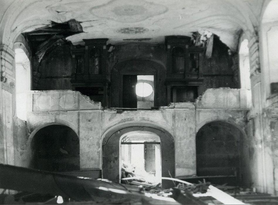 Měcholupy, kostel sv. Vavřince, interiér kostela před demolicí