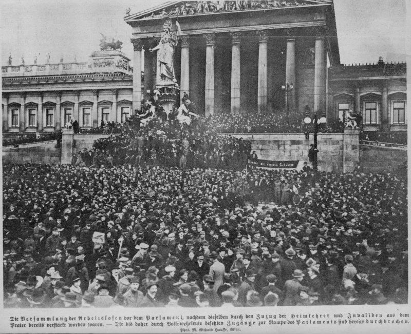 Kommunistische Unruhen in Wien. Demonstranten vor und auf der Parlamentsrampe