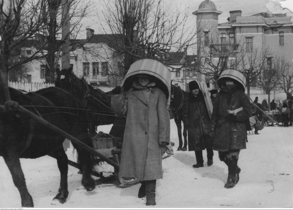 Мужчины, возвращающиеся с ярмарки с купленными балами на головах