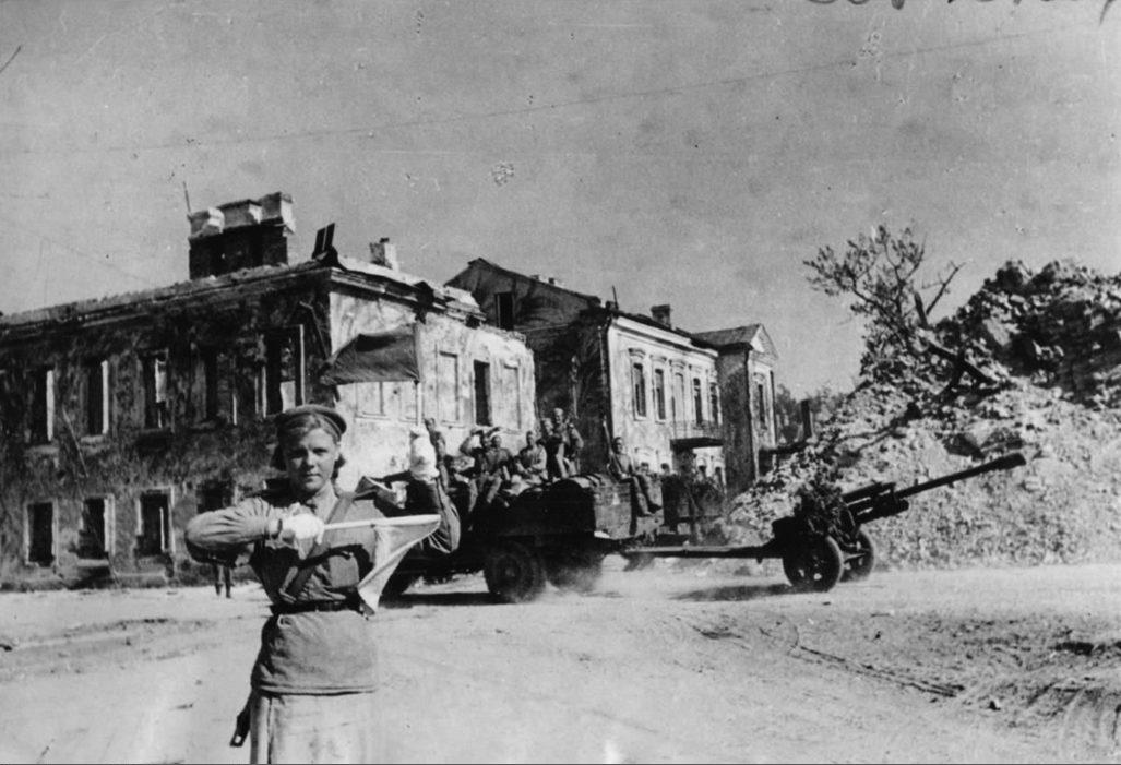 Лето 1944 года. Регулировщица в освобожденном Полоцке на Корпусной площади