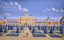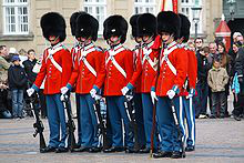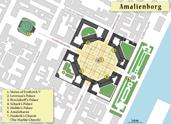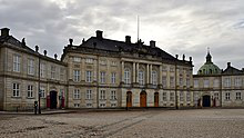 Amalienborg is the home of the Danish royal family, and is located in Copenhagen, Denmark. It consists of four identical classical palace façades with rococo interiors around an octagonal courtyard ; in the centre of the square is a monumental equestrian statue of Amalienborg's founder, King Frederick V.