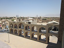 The Amir Chakhmaq Complex is a prominent structure in Yazd, Iran, noted for its symmetrical sunken alcoves. It is a mosque located on a square of the same name. It also contains a caravanserai, a tekyeh, a bathhouse, a cold water well, and a confectionery. At night, the building is lit up after twilight hours after sun set with orange lighting in the arched alcoves which makes it a spectacle. During the Iran–Iraq War and the Iraq wars with the United States and Afghanistan, many Iraqis and Afghanis came to inhabit the Amir Chakhmaq Square.