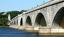 The Arlington Memorial Bridge is a Neoclassical masonry, steel, and stone arch bridge with a central bascule that crosses the Potomac River at Washington, D.C., the capital of the United States. First proposed in 1886, the bridge went unbuilt for decades thanks to political quarrels over whether the bridge should be a memorial, and to whom or what. Traffic problems associated with the dedication of the Tomb of the Unknown Soldier in November 1921 and the desire to build a bridge in time for the bicentennial of the birth of George Washington led to its construction in 1932.