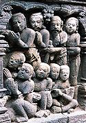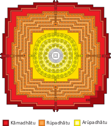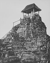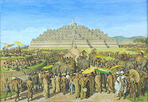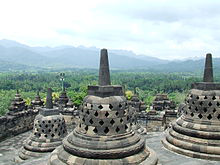 Borobudur, or Barabudur is a 9th-century Mahayana Buddhist temple in Magelang Regency, not far from the town of Muntilan, in Central Java, Indonesia. It is the world's largest Buddhist temple. The temple consists of nine stacked platforms, six square and three circular, topped by a central dome. It is decorated with 2,672 relief panels and 504 Buddha statues. The central dome is surrounded by 72 Buddha statues, each seated inside a perforated stupa.