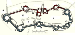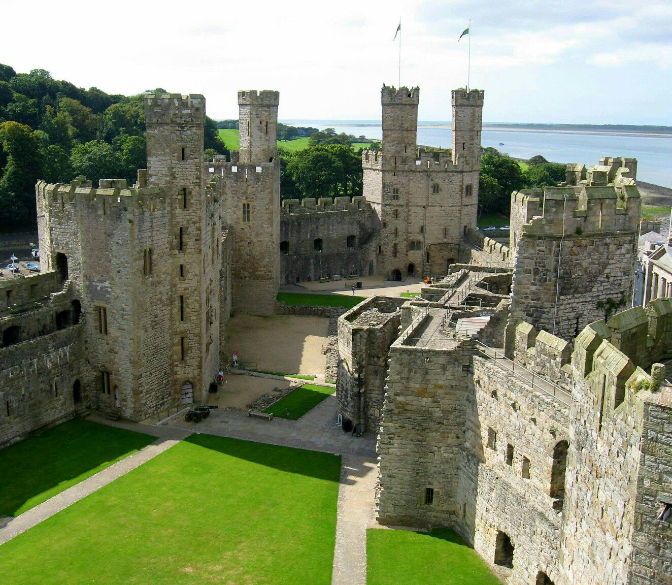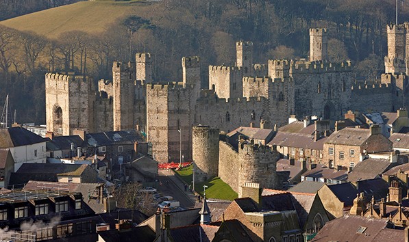 Caernarfon Castle – often anglicised as Carnarvon Castle or Caernarvon Castle – is a medieval fortress in Caernarfon, Gwynedd, north-west Wales cared for by Cadw, the Welsh Government's historic environment service. It was a motte-and-bailey castle from the late 11th century until 1283 when King Edward I of England began to replace it with the current stone structure. The Edwardian town and castle acted as the administrative centre of north Wales, and as a result the defences were built on a grand scale. There was a deliberate link with Caernarfon's Roman past, and the Roman fort of Segontium is nearby.