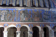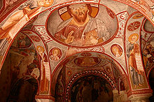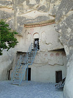 Göreme is a district of the Nevşehir Province in Turkey. After the eruption of Mount Erciyes about 2.6 million years ago, ash and lava formed soft rocks in the Cappadocia Region, covering a region of about 20,000 square kilometres . The softer rock was eroded by wind and water, leaving the hard cap rock on top of pillars, forming the present-day fairy chimneys. People of Göreme, at the heart of the Cappadocia Region, realized that these soft rocks could be easily carved out to form houses, churches, and monasteries. These Christian sanctuaries contain many examples of Byzantine art from the post-iconoclastic period. These frescos are a unique artistic achievement from this period.
