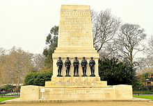 The Guards Memorial, also known as the Guards Division War Memorial, is an outdoor war memorial located on the west side of Horse Guards Road, opposite Horse Guards Parade in London, United Kingdom. It commemorates the war dead from the Guards Division and related units during the First World War, and of the Household Division in the Second World War and other conflicts since 1918.