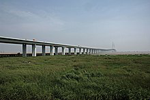 Hangzhou Bay Bridge is a long 35.7 km highway bridge with two separate cable-stayed portions, built across the mouth of Hangzhou Bay in the eastern coastal region of China. It connects the municipalities of Jiaxing and Ningbo in Zhejiang province.