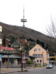 Jakobsberg Telecommunication Tower is a 142-metre-tall TV tower built of reinforced concrete on the 238-metre-high elevated Jakobsberg near Porta Westfalica. Jakobsberg Telecommunication Tower was built May 1, 1974 and September 28, 1978 as replacement for a small telecommunication tower also equipped with an observation deck, which was built in 1952 on the site of the former Bismarck column, erected in 1902. Jakobsberg Telecommunication Tower is equipped with a room for technical equipment in a height of 50 metres and an observation deck in a height of 23.25 metres. Its main purpose is the transmission of television and radio signals, since 2006 the television signals are sent in DVB-T. For access to the observation deck, there is a stairway running like a srewline around the tower. This stairway gives the lowest sections of Jakobsberg Telecommunication Tower, which is property of Deutsche Telekom, its characteristic design.