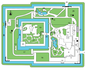 Nijō Castle is a flatland castle in Kyoto, Japan. The castle consists of two concentric rings of fortifications, the Ninomaru Palace, the ruins of the Honmaru Palace, various support buildings and several gardens. The surface area of the castle is 275,000 square metres , of which 8,000 square metres is occupied by buildings.