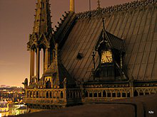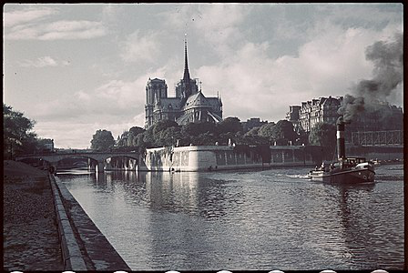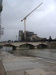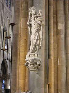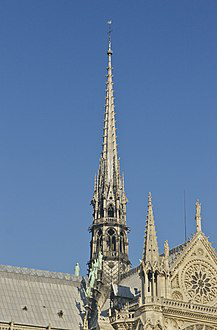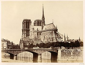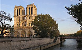 Notre-Dame de Paris ; meaning "Our Lady of Paris"), referred to simply as Notre-Dame, is a medieval Catholic cathedral on the Île de la Cité in the 4th arrondissement of Paris. The cathedral was consecrated to the Virgin Mary and considered to be one of the finest examples of French Gothic architecture. Its pioneering use of the rib vault and flying buttress, its enormous and colourful rose windows, as well as the naturalism and abundance of its sculptural decoration set it apart from the earlier Romanesque style. Major components that make Notre Dame stand out include its large historic organ and its immense church bells.