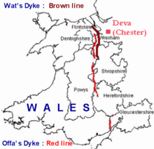 Offa's Dyke is a large linear earthwork that roughly follows the current border between England and Wales. The structure is named after Offa, the Anglo-Saxon king of Mercia from AD 757 until 796, who is traditionally believed to have ordered its construction. Although its precise original purpose is debated, it delineated the border between Anglian Mercia and the Welsh kingdom of Powys.
