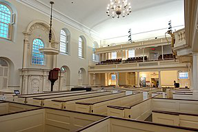 The Old South Meeting House is a historic Congregational church building located at the corner of Milk and Washington Streets in the Downtown Crossing area of Boston, Massachusetts, built in 1729. It gained fame as the organizing point for the Boston Tea Party on December 16, 1773. Five thousand or more colonists gathered at the Meeting House, the largest building in Boston at the time.