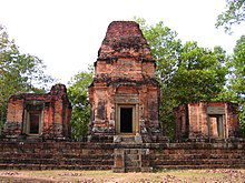 Prasat Bei is a temple with three brick towers in a north-south row, facing to the east, and standing on a laterite platform. The central tower contained a linga; the flanking towers reach no higher than the doorways. Only the lintels of the central and south towers were carved, both showing Indra on the elephant Airavata.