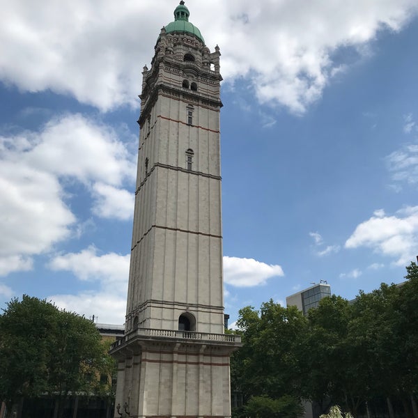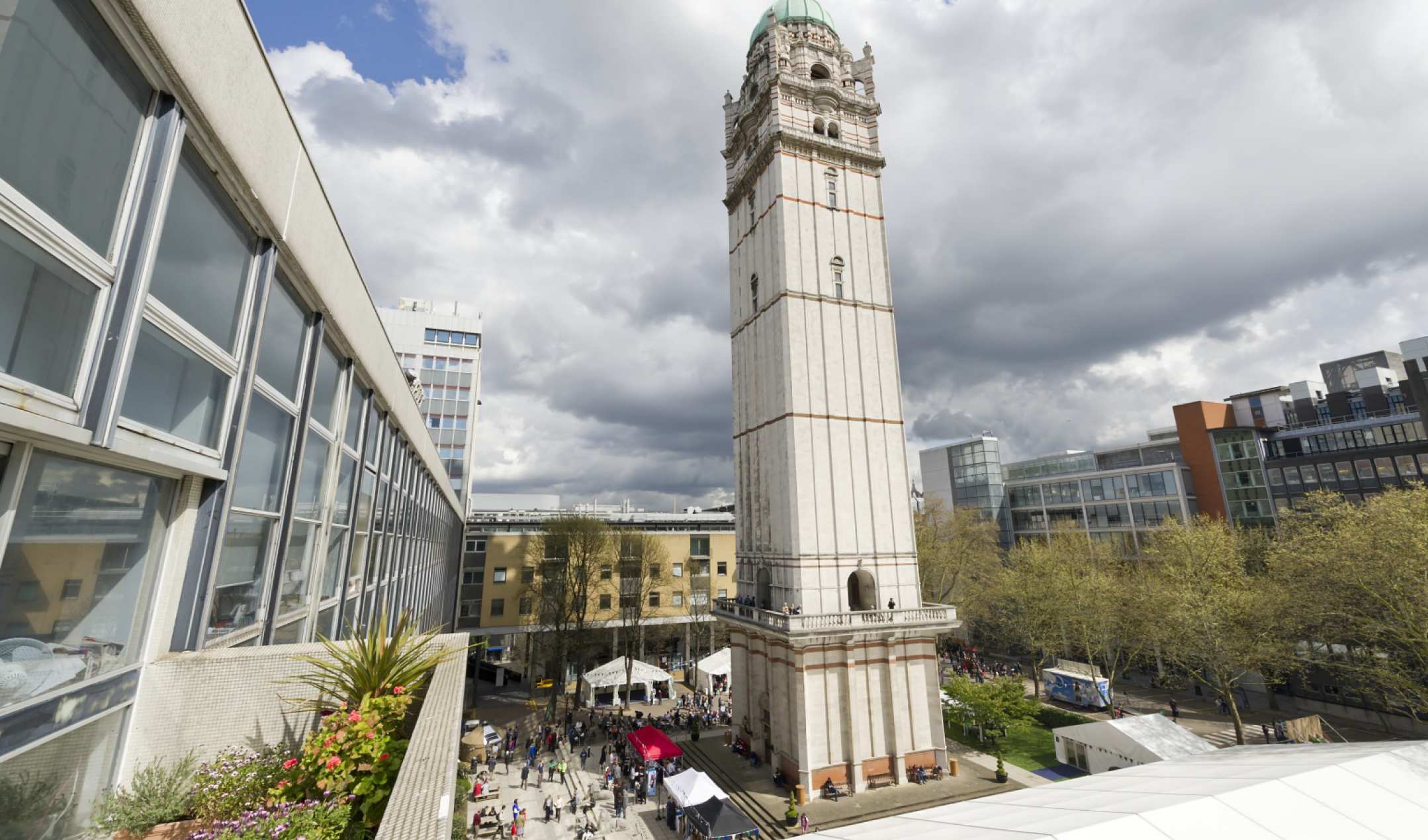 The Queen's Tower is situated in the South Kensington Campus of Imperial College London, England, just to the north of Imperial College Road. It is 87 metres tall with a copper-covered dome at its top. To reach the base of the dome from the ground on foot, one must ascend a series of narrow spiral staircases, comprising 325 steps in total. The tower used to be the central tower of the Imperial Institute, and is now the sole remaining part of that building.