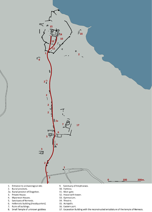 Rhamnous , also Ramnous or Rhamnus, was an ancient Greek city in Attica situated on the coast, overlooking the Euboean Strait. Its impressive ruins lie northwest of the modern town of Agia Marina in the municipality of Marathon.