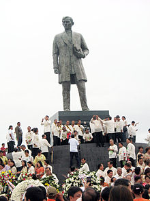 The Rizal Monument in Calamba is a monument built to commemorate the sesquicentennial birth anniversary of Dr. José Rizal, the Philippines' unofficial national hero and the greatest son of Calamba. It is a 6.7 metres statue sculpted by Jonas Roces and is located at The Plaza, a 6.7-hectare park in front of the Calamba City Hall Complex along Bacnotan Road in the barangay of Real. President Benigno Aquino III led the unveiling of the monument on June 19, 2011. The monument was cited as the tallest Rizal monument in the world before former Laguna Governor Jeorge 'E.R.' Ejercito Estregan inaugurated a 26 feet bronze Rizal Monument sculpted by Toym Imao, son of National Artist for Sculpture Abdulmari Asia Imao in Santa Cruz, Laguna for the 2014 Palarong Pambansa hosted by the province.