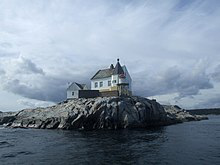 Saltholmen Lighthouse is a lighthouse in Lillesand municipality in Agder county, Norway. It is located on a small island off the coast about 2 kilometres southeast of the town of Lillesand. There has been a lighthouse here since 1882. The island are named Saltholmen . This name comes from the salt extraction industry established by Hans Nielsen Hauge that once was located there. The lighthouse is only accessible by boat and the site is open, but the building is not open to the public.