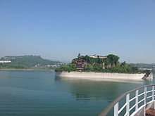 Shibaozhai is a hill along the bank of the Yangtze River in Zhong County, Chongqing, China. This rocky and craggy hill has extremely steep sides and is about 200 meters tall. On the river side is a red pavilion which leans against the side of the hill providing a walkway to the temple at the top. One of the largest wooden temple, red pavilion built at the side of rock and has nine floors. A yellow entrance at the base of the pavilion provides an entrance.