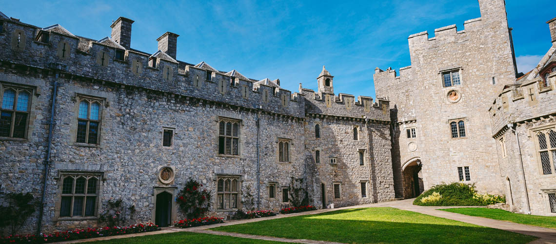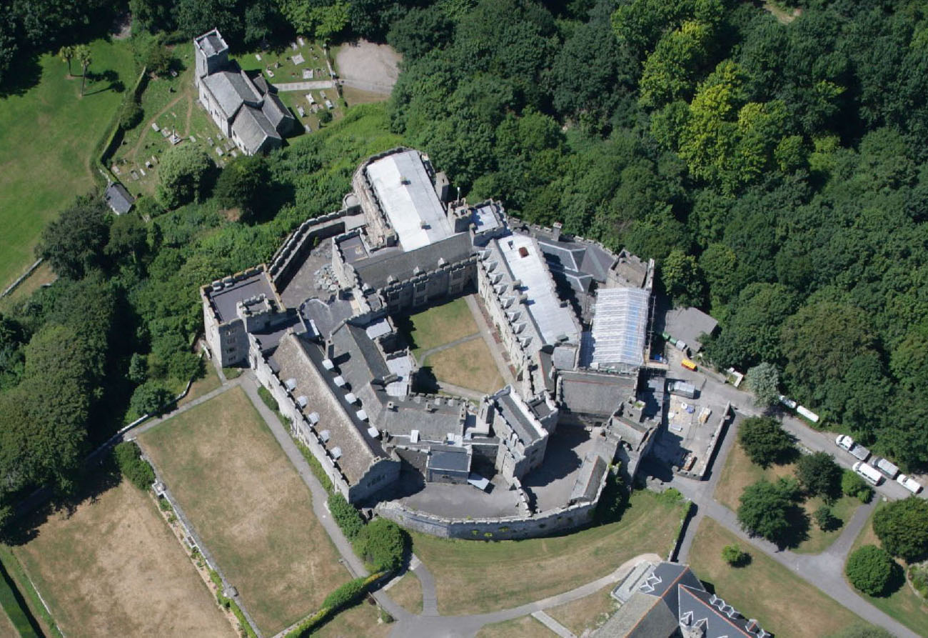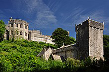 St Donat's Castle , St Donats, Wales, is a medieval castle in the Vale of Glamorgan, about 16 miles to the west of Cardiff, and about 1 ⁄2 miles to the west of Llantwit Major. Positioned on cliffs overlooking the Bristol Channel, the site has been occupied since the Iron Age, and was by tradition the home of the Celtic chieftain Caradog. The present castle's origins date from the 12th century when the de Haweys and later Peter de Stradling began its development. The Stradlings held the castle for four hundred years, until the death of Sir Thomas Stradling in a duel in 1738.