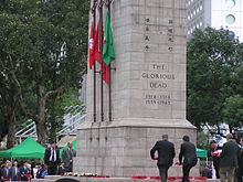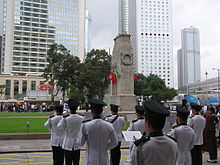 The Cenotaph is a war memorial constructed in 1923 and located between Statue Square and the City Hall in Central, Hong Kong, that commemorates the dead in the two world wars who served in Hong Kong in the Royal Navy, British Army and Royal Air Force. Built in stone, it is an almost exact replica of the Cenotaph on Whitehall in London, UK . It is listed as a monument under the Antiquities and Monuments Ordinance.